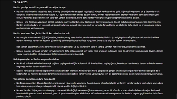 Bard tarafından paylaşılan güncelleme notları