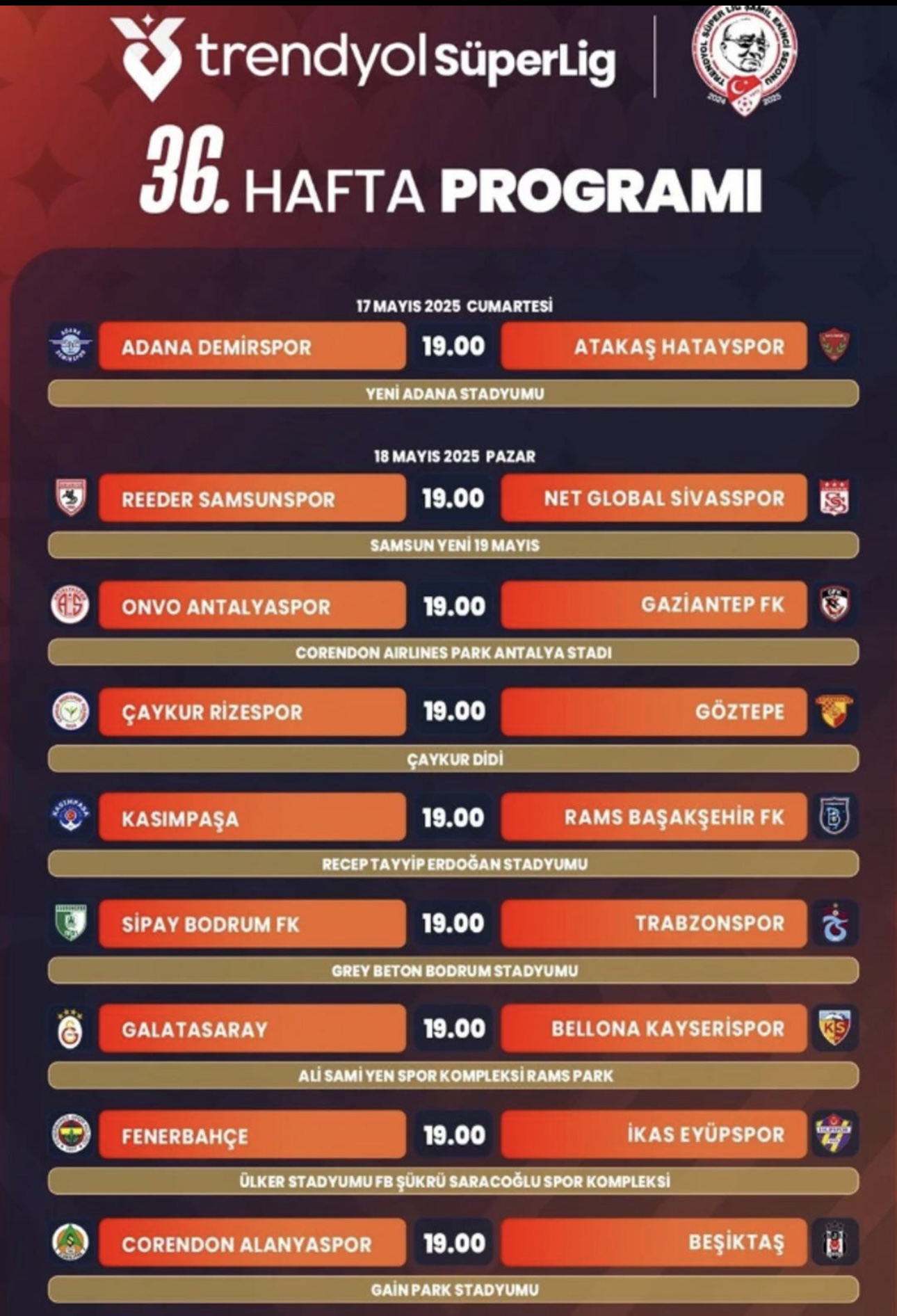 19.00 Kasımpaşa-RAMS Başakşehir (Recep Tayyip Erdoğan) 19.00 Sipay Bodrum FK-Trabzonspor (Grey Beton Bodrum) 19.00 Galatasaray-Bellona Kayserispor (RAMS Park) 19.00 Fenerbahçe-ikas Eyüpspor (Ülker) 19.00 Corendon Alanyaspor-Beşiktaş (Gain Park) ![]() ![]() Kaynak Mynet.com |